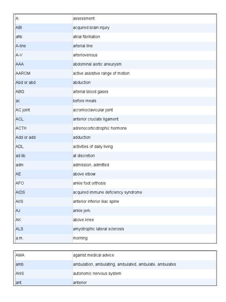 Given that we have included as many terms as possible, this page may take a few seconds to load. Medical abbreviations and acronyms represent acceptable terms used by physicians and other health care professionals commonly as a reference to rapidly search and accurately record. Access to community care and effective services and support. By reviewing a medical abbreviations list, you can determine the meaning of the notations made by a nurse or doctor on your medical records. The advantages of brevity should be weighed against the possibilities of obfuscation (making the communication harder for others to understand) and ambiguity.